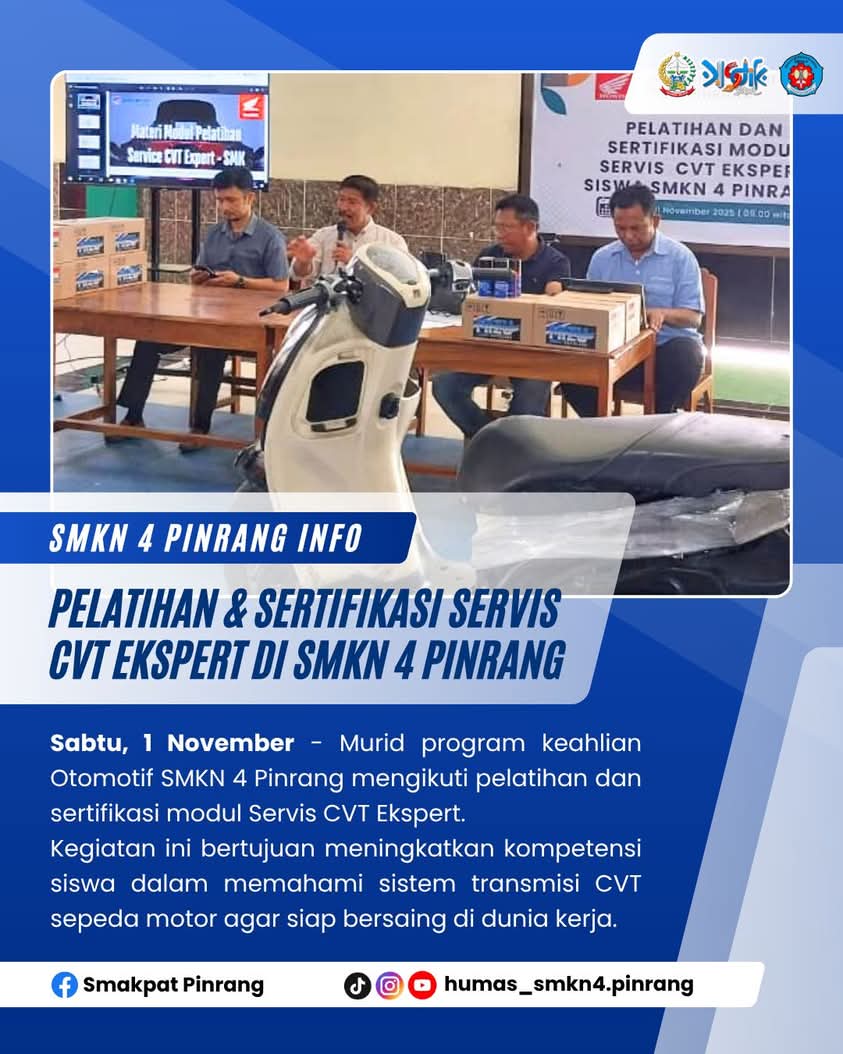 SMKN 4 Pinrang terus berupaya meningkatkan kualitas kompetensi muridnya melalui kegiatan Pelatihan dan Sertifikasi Modul Servis CVT Ekspert yang dilaksanakan oleh program keahlian Teknik Otomotif bekerja sama dengan Astra Motor.