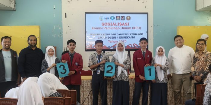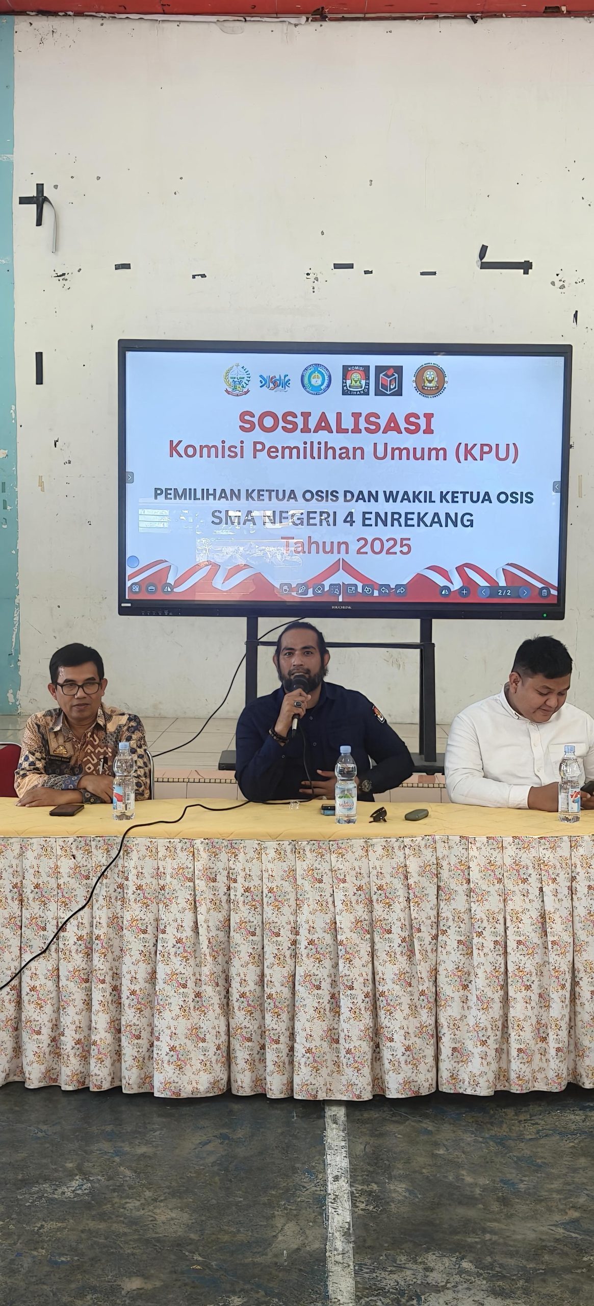 Kegiatan sosialisasi tentang pemilih pemula di SMA Negeri 4 Enrekang tanggal 18 September 2025 yang berlangsung di AULA berjalan lancar dan sukses. Sebanyak 210 peserta didik mengikuti kegiatan sosialisasi dan semua peserta didik sangat antusias mendengarkan sosialisasi KPU. Hadir melakukan sosialisasi adalah bapak ketua KPU Kabupaten Enrekang bapak Munir Anas, S.Pd.I dan anggota KPU bapak Maswar BR, SH.