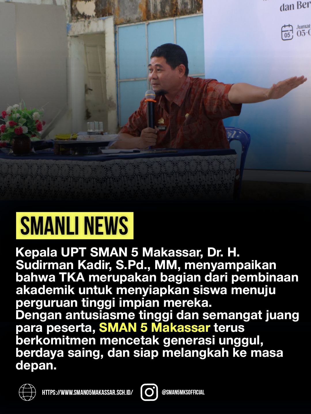 Sementara Kepala sekolah SMAN 5 Makassar Dr.H.Sudirman Kadir.S.Pd.MM, menyampaikan bahwa TKA bagian dari pembinaan akademik untuk menyampaikan siswa menuju perguruan tinggi impian Dengan Antusias tinggi dan semangat juang,para peserta SMAN 5 Makassar terus berkomitmen mencetak generasi unggul, berdaya saing, dan siap melangkah ke masa depan, ungkapnya.H.Sudirman.