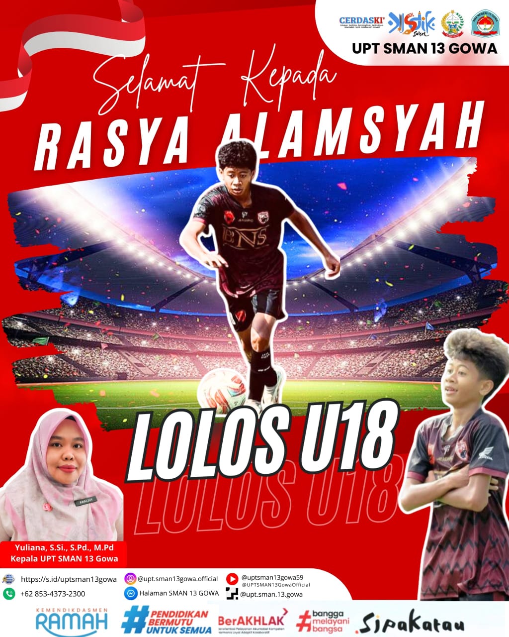 Dengan penuh kebanggaan keluarga Besar UPT SMAN 13 GOWA terkhusus ibu Kepala UPT yakni Ibu Yuliana, S.Si., S.Pd., M.Pd. mengucapkan selamat kepada Ananda Rasya Alamsyah, siswa kelas XI KM 1, atas keberhasilannya lolos dalam seleksi akhir U18. Pencapaian ini merupakan hasil dari proses seleksi yang ketat dan penuh tantangan, yang diikuti oleh Ananda dengan penuh semangat dan dedikasi tinggi.