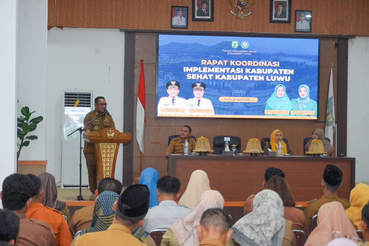 Bupati Luwu, Patahudding, membuka Rapat Koordinasi Penguatan Forum dan Implementasi Kabupaten Sehat Luwu di Aula Rujab Bupati Luwu, Senin (20/4/2026).