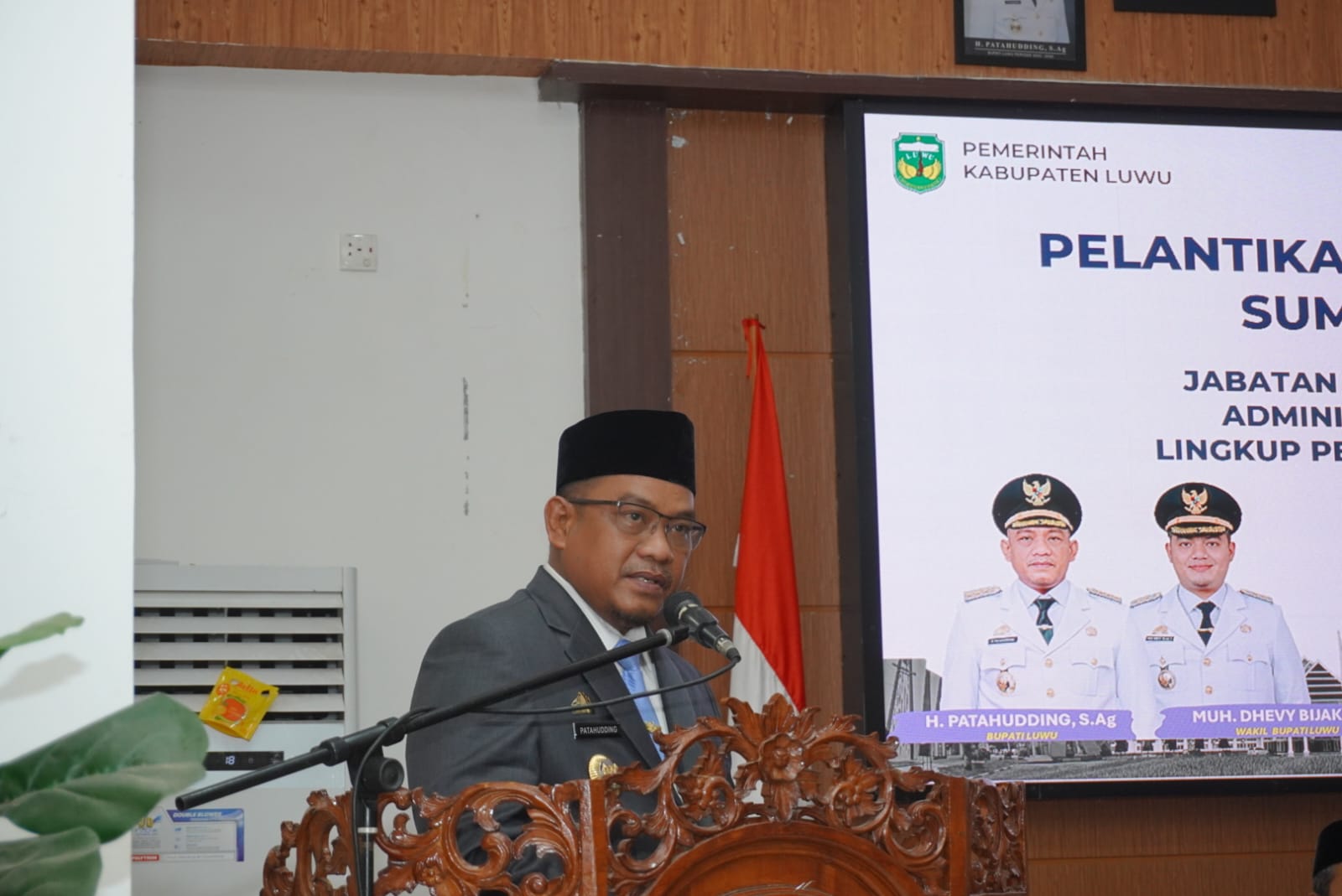 Bupati Luwu, Patahudding, melantik dan mengambil sumpah Jabatan Pimpinan Tinggi Pratama, Administrator, dan Pengawas lingkup Pemerintah Kabupaten Luwu. Sebanyak 72 pejabat resmi dilantik untuk memperkuat struktur birokrasi dan meningkatkan kualitas pelayanan publik. Kegiatan berlangsung di Aula Rumah Jabatan Bupati Luwu, Kelurahan Pammanu, Kecamatan Belopa Utara, Jumat (20/2/2026).