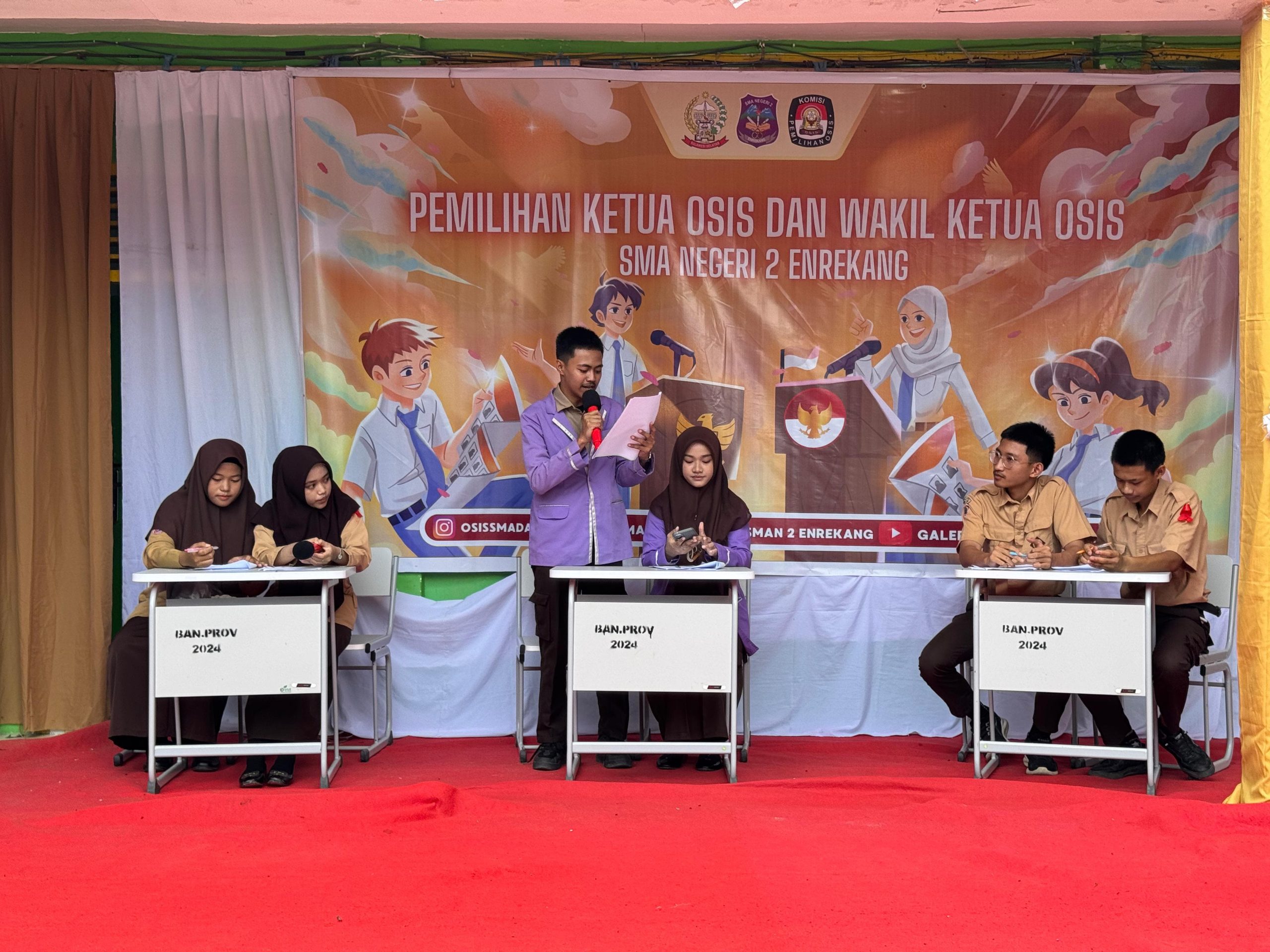 Pada hari Jum’at, 25 September 2025, SMA Negeri 2 Enrekang dalam hal ini Komisi Pemilihan OSIS (KPO) mengadakan acara penting dalam rangkaian kegiatan pemilihan Ketua dan Wakil Ketua OSIS untuk periode 2025/2026. Acara ini berlangsung setelah kegiatan Literasi Kitab Suci Al Qur’an dan Senam Sehat Anak Indonesia Hebat, yang diakhiri dengan menyanyikan Lagu Indonesia Raya oleh seluruh warga sekolah.
