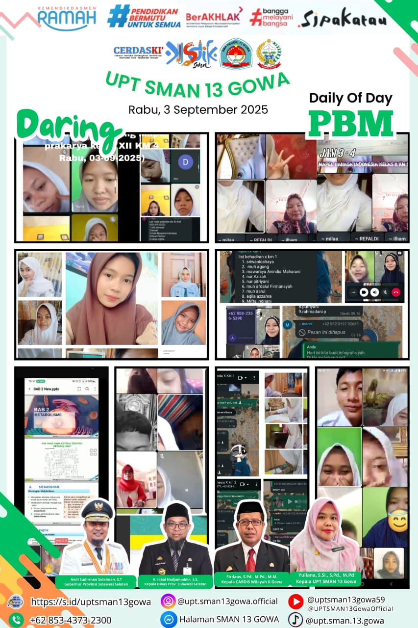 Hari ini, Rabu, 3 September 2025, UPT SMAN 13 GOWA kembali melakukan proses pembelajaran secara daring. Meskipun pembelajaran dilakukan secara daring, semangat dan keaktifan siswa dalam mengikuti proses pembelajaran tidak terhambat. Setiap guru diharapkan dapat mengontrol kehadiran siswa secara maksimal untuk memastikan proses pembelajaran berjalan efektif.