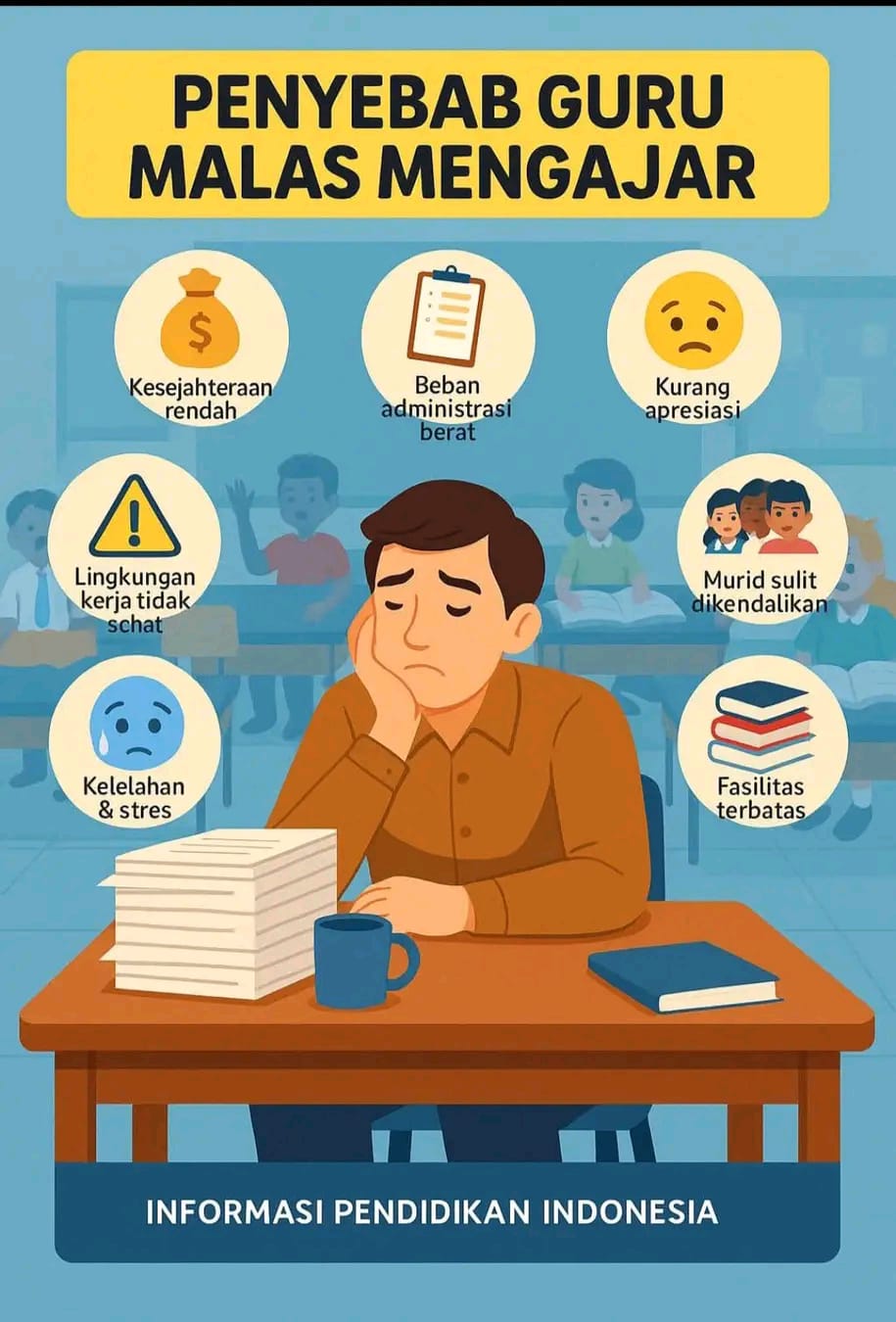 6. Kelelahan dan Stres yang Menggerogoti: Guru juga manusia biasa yang memiliki keterbatasan fisik dan mental. Tuntutan pekerjaan yang tinggi, masalah keluarga, dan tekanan ekonomi dapat menyebabkan kelelahan dan stres yang kronis. Jika tidak dikelola dengan baik, stres dapat memicu depresi dan burnout, yang pada akhirnya menurunkan motivasi guru untuk mengajar.