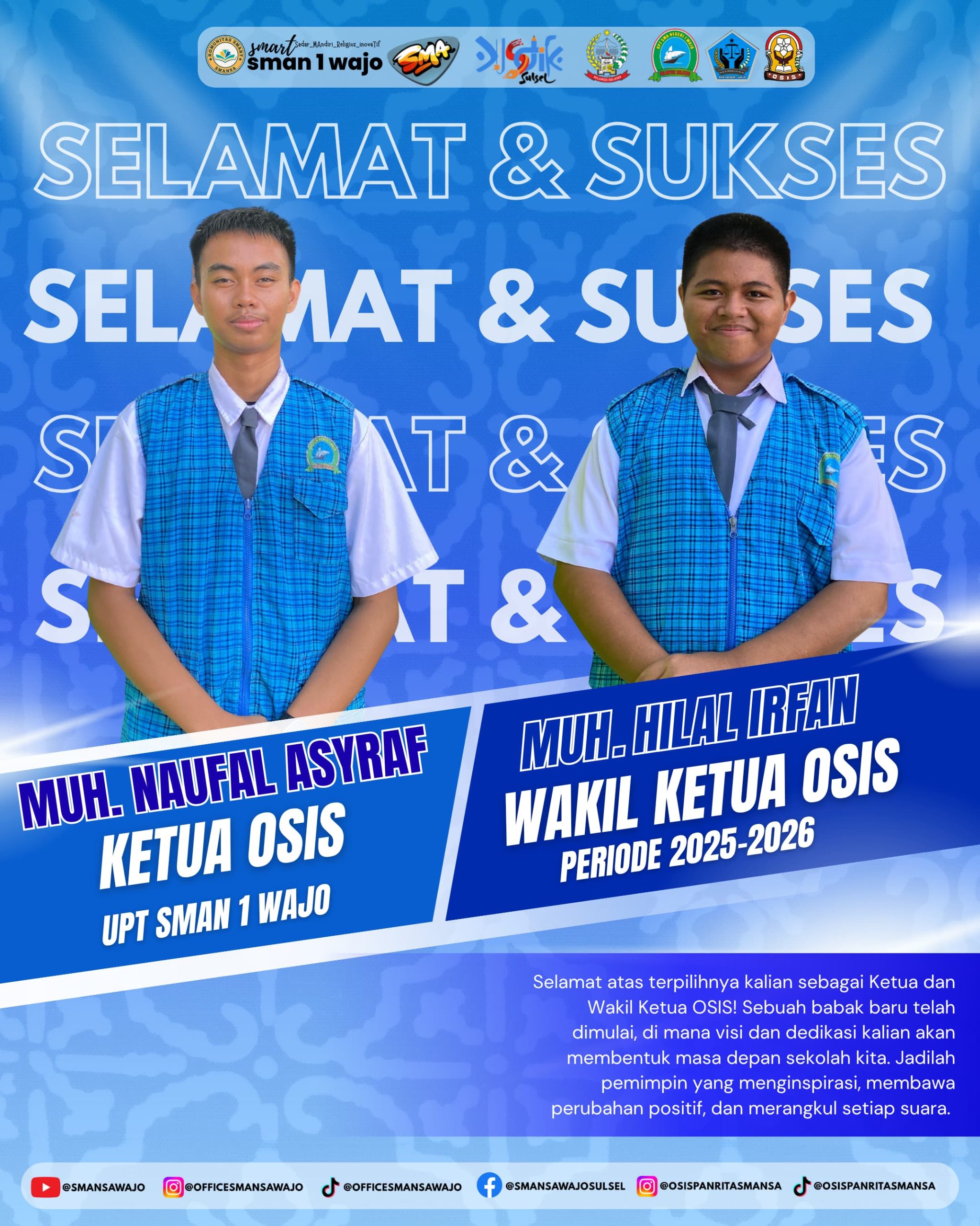 Terima kasih kepada seluruh siswa dan guru UPT SMAN 1 Wajo yang telah mempercayakan kami sebagai ketua OSIS. Kami berjanji akan bekerja keras untuk meningkatkan kualitas sekolah dan memenuhi aspirasi siswa,” ungkap Muh