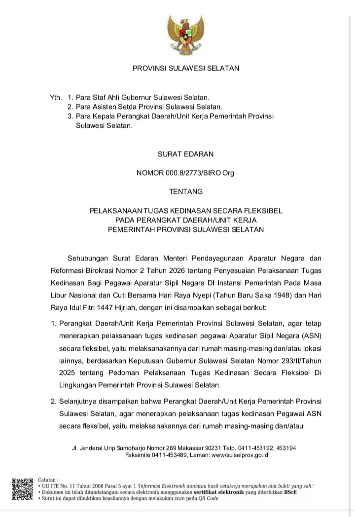 Surat edaran mulai disampaikan ke setiap OPD, Rabu (4/3/2026). Di Dinas Pendidikan Sulsel, dilakukan revisi FWA menyesuaikan surat edaran tersebut.