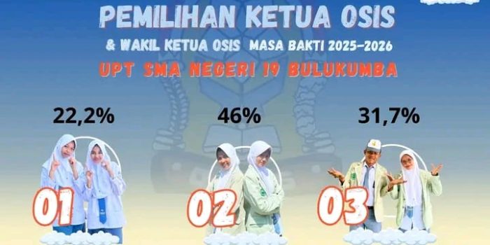 SMAN 19 Bulukumba kembali mencatatkan sejarah demokrasi di lingkungan sekolah dengan terselenggaranya pemilihan ketua dan wakil ketua OSIS periode 2025 – 2026. Pemungutan suara berlangsung pada Senin (29/09/2025) pagi hari secara langsung, umum, bebas, dan rahasia, dengan melibatkan seluruh warga sekolah.