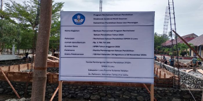 Sementara SMKN 2 Luwu Belopa Sulawesi Selatan mendapatkan pembangunan gedung baru RPS SMKN 2 LUWU serta Ruang kelas, kata kepala sekolah SMKN 2 Nur Insani.S.Pd.M.Pd saat ditemui areal Pembangunan pekerjaan Revitalisasi hari Sabtu tanggal 9/8/2025.
