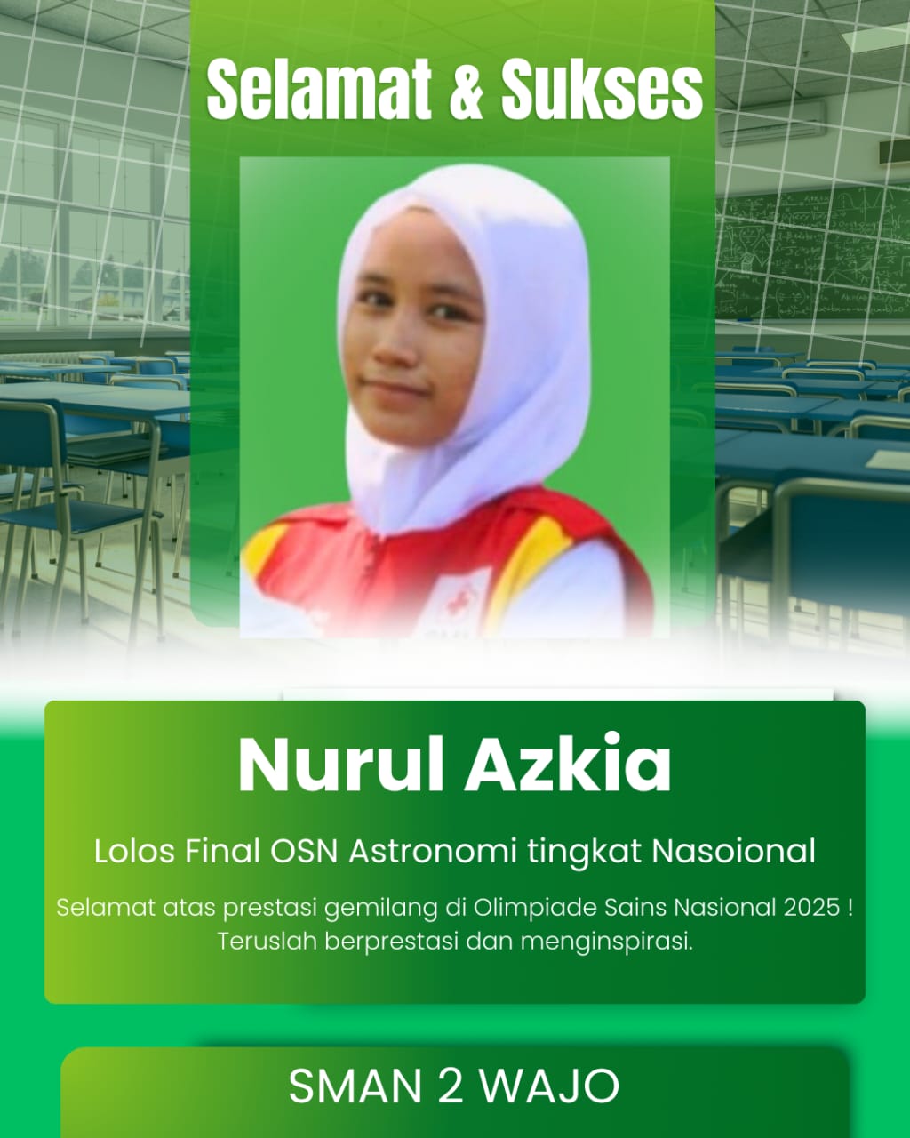 Prestasi gemilang kembali ditorehkan dunia pendidikan Sulawesi Selatan. Seorang siswi terbaik SMAN 2 Wajo, Nurul Azkia, berhasil menembus babak final Olimpiade Sains Nasional (OSN) 2025 pada bidang Astronomi. Dari 100 peserta yang berkompetisi di tahap semifinal, hanya 60 siswa yang berhasil melaju ke final, dan Nurul menjadi satu-satunya wakil dari Sulawesi Selatan di cabang Astronomi
