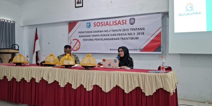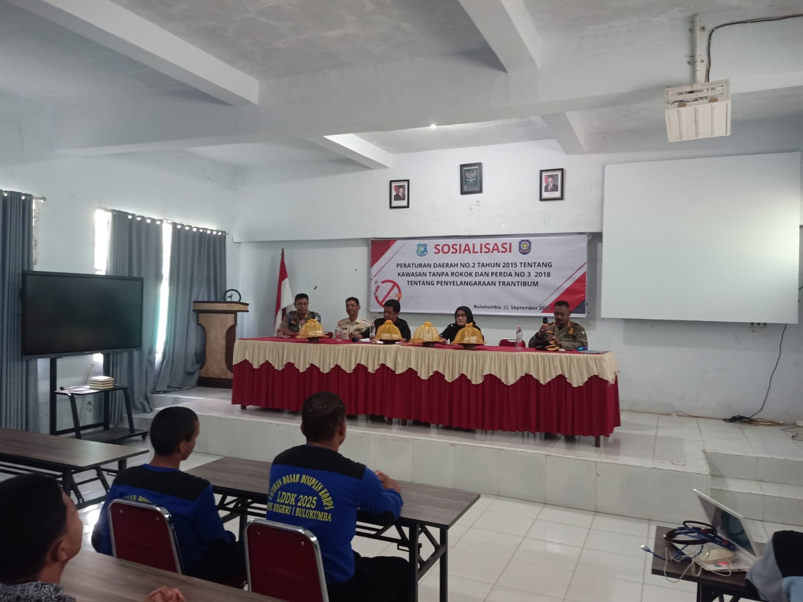 Sosialisasi Perda No. 2 Tahun 2015 tentang Kawasan Tanpa Rokok dan Perda No. 3 Tahun 2018 tentang Penyelenggaraan Trantibum oleh Satuan Polisi Pamong Praja Damkar & BPBD Bulukumba di aula SMKN 1 Bulukumba. Kasatpol PP Damkar & Kabid BPBD .Bulukumba, Andi Hasbullah, STP, didampingi Tim antara lain : Panai Mul, S. Sos, MSi, dan Zulkarnaim, SE.