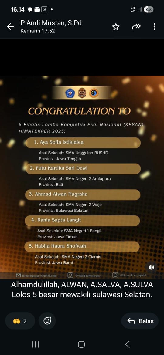 Prestasi membanggakan kembali diraih oleh SMA Negeri 2 Wajo. Tim yang terdiri dari Ahmad Alwan Nugraha, Andi Zalfa Aniqah Herani, dan Andi Zulfa Aliyah Herani berhasil menembus lima besar finalis Lomba Kompetisi Esai Nasional (KESAN) HIMATEKPER 2025, mewakili Provinsi Sulawesi Selatan di ajang bergengsi tingkat nasional tersebut.